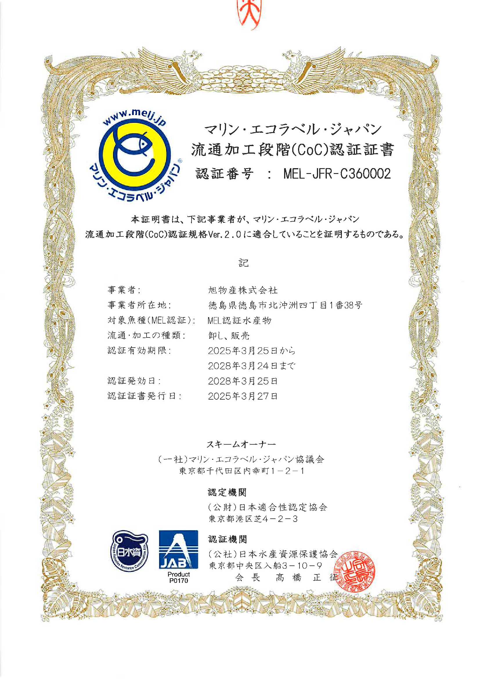 旭物産株式会社、MEL認証(CoC) (認証規格Ver2.0)取得のお知らせ