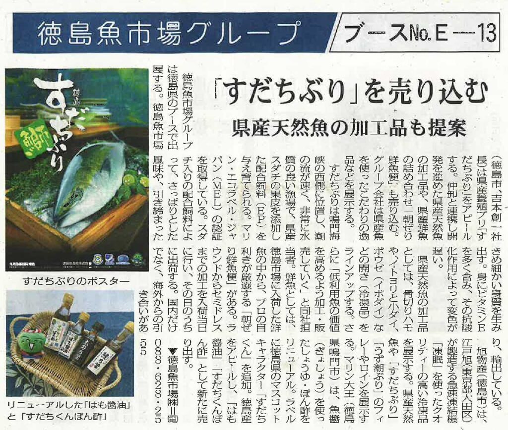 令和7年8月18日(月)付のみなと新聞に、 徳島魚市場グループが出展する「すだちぶり」や