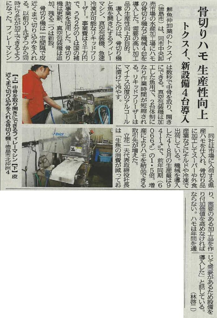 令和7年9月27日(土)付の徳島新聞に、 徳島市中央卸売市場の仲卸「トクスイ」が掲載されました。